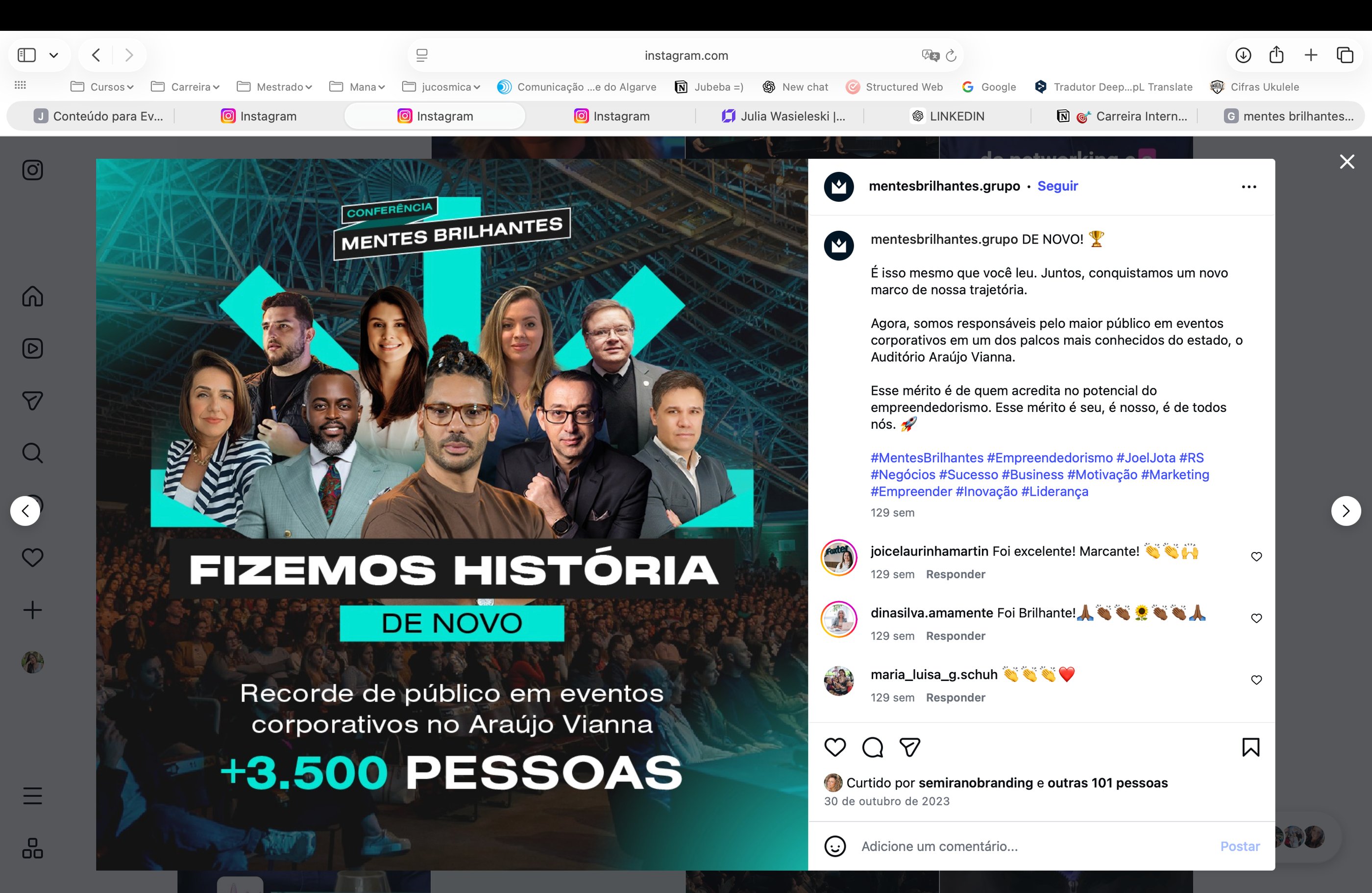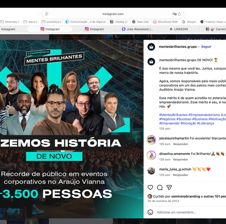 I led the rebranding initiative for Mentes Brilhantes and developed the marketing strategy for the Mentes Brilhantes Conference, the flagship event within its ecosystem. The project involved repositioning the brand identity and its sub-brands, as well as planning and executing the conference’s communication strategy, contributing to a sold-out event, with 3,500 in-person attendees and over 4.7 million impressions.