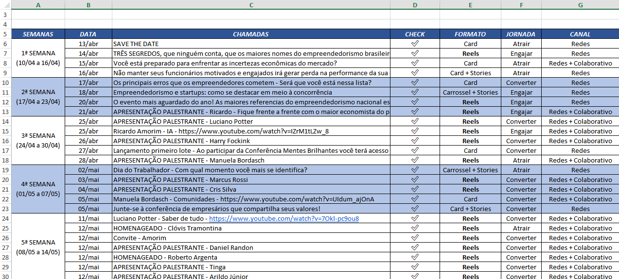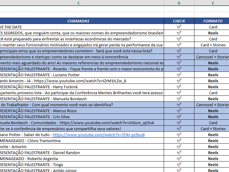 Developed a complete content calendar for all social media channels, organizing posts by theme, format (reels, stories, feed), and publishing schedule.